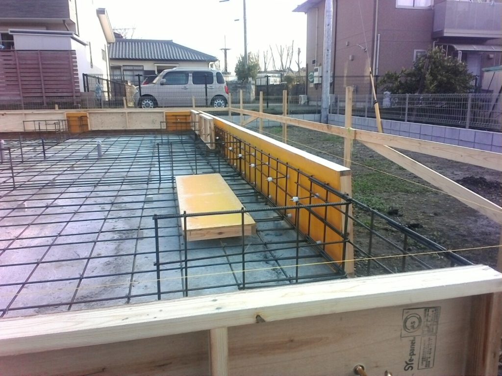 画像は捨てコンの上に鉄筋を配し型枠を組んでいる場面。型枠完成後に、ベタ、立上りの順に生コンを時差をおいて打設していきます。